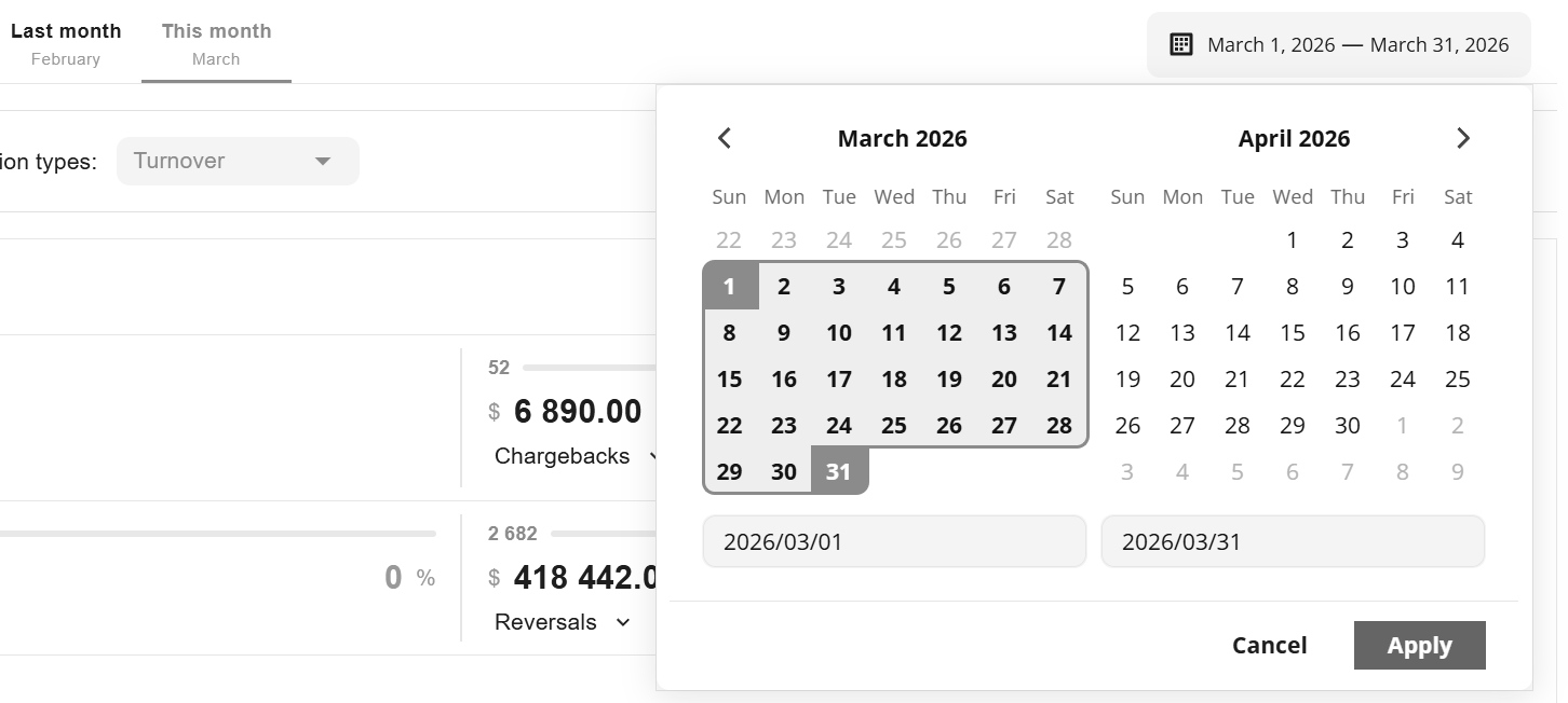 This statistics screen can be used for a visual assessment of the most frequent decline reasons, as well as chargeback and fraud reasons.