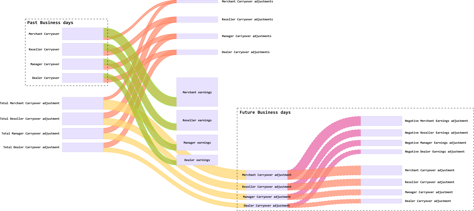 merchant statements are generated, merchant statements are detailed by terminals, indicating the reseller; adjustments are applied to the carryover paid to the merchant from the reseller or manager in his absence; earnings adjustments are accrued; the final balance of the current period is calculated as: the difference between the reseller (manager) and merchant transaction commissions applied; in the final, the reseller (manager) carryover is added minus the carryover adjustments and the amount of the merchant’s transactions excluding the amount of service operations and a Money Transfer type operation,