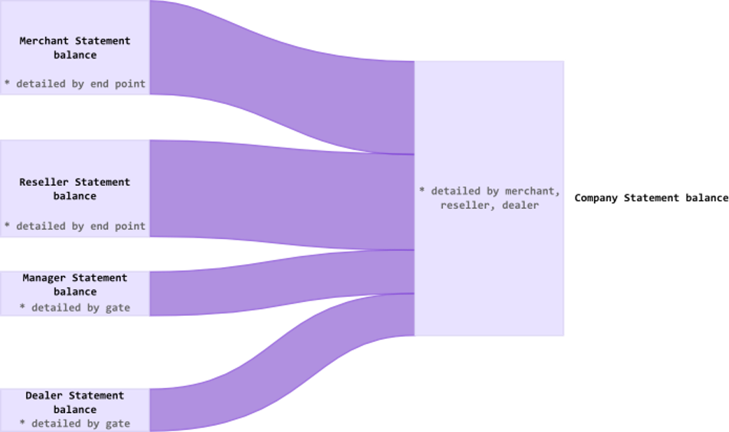 after the formation of statements for all counterparties are combined into statements for companies; statements for companies are detailed by merchant, reseller, dealer and manager, for the possibility of accounting for paid funds on the company’s balance sheet; of all the carryovers and holds, only the bank’s carryover and hold are taken into account in the company’s statements.
