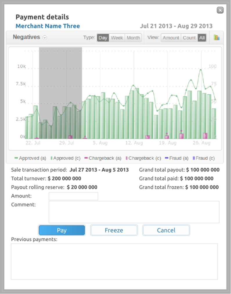 Delay — is a mechanism for short-term postponement of payments for positive transaction volumes, which allows to form a safety cushion equal to the average merchant’s turnover for the paid period. It allows to minimize the risks of negative activity during the merchant’s work.