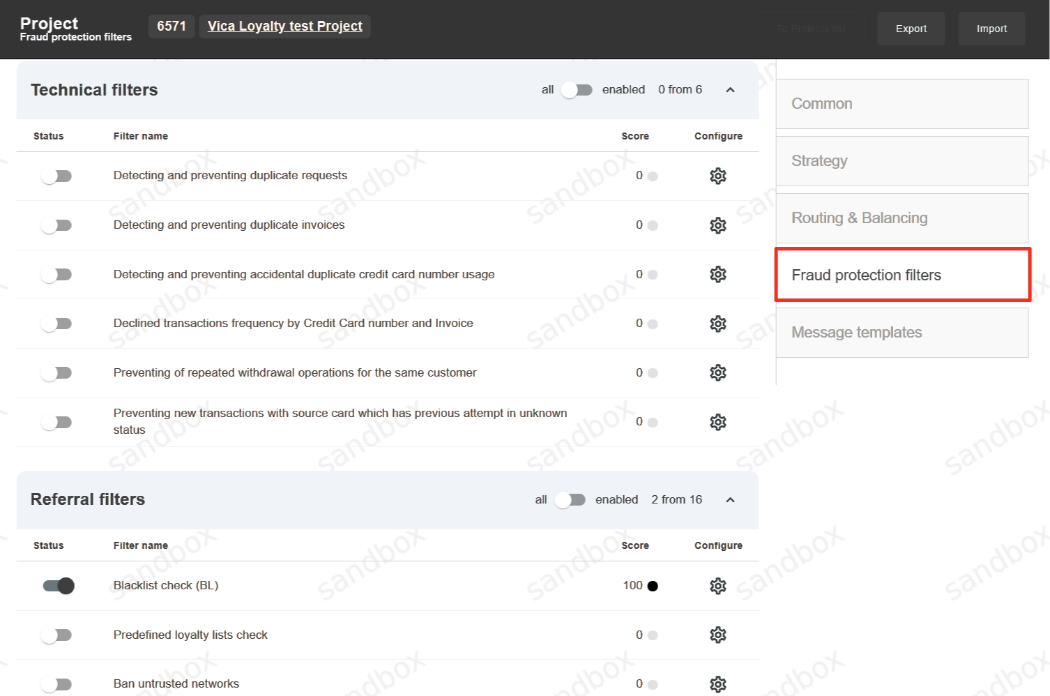 The Transaction filters are managed on a Project-level of the System. To set filters for the Project navigate to Fraud protection filters in the Project menu.