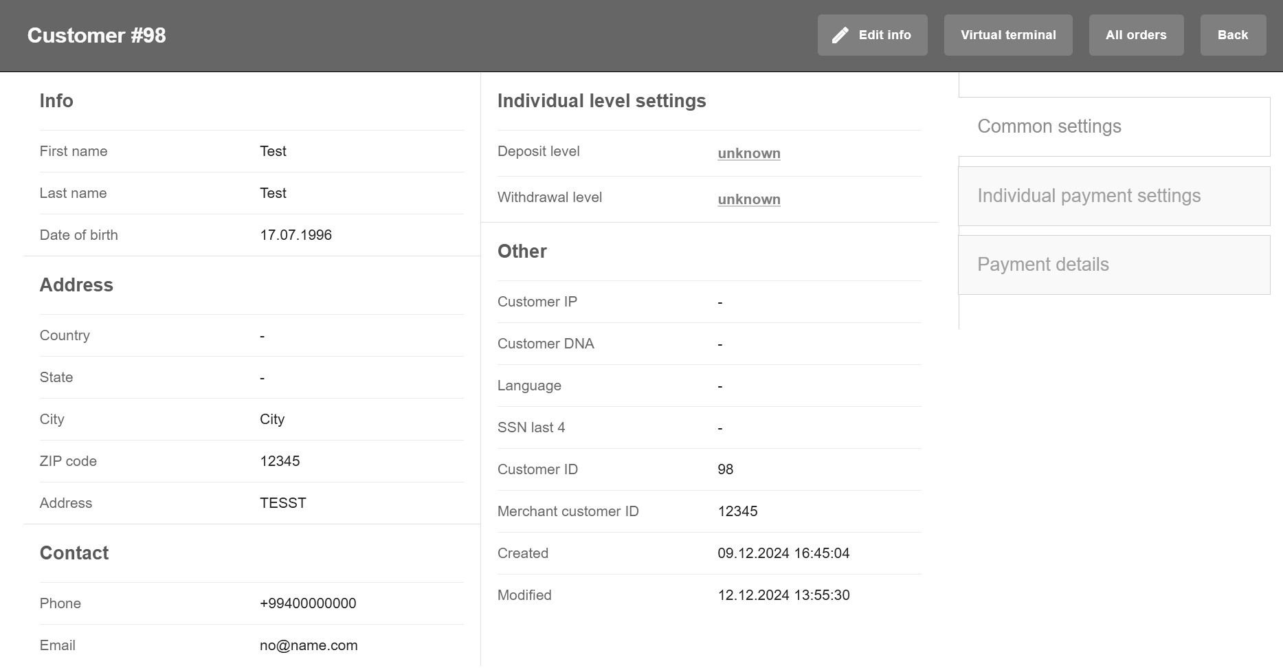 In Common settings all customer information will be shown. Press Edit info to change customer information except Customer ID and Merchant customer ID. The Virtual terminal button will allow to open the virtual terminal with al customer information directly from this screen. All orders will show all orders associated with customer.