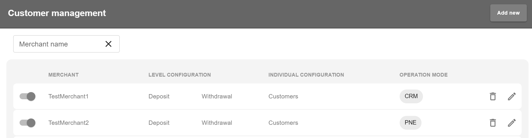 On this screen it is possible to make a search by Merchants or to add new Merchant(Configuration) into the Customer Management module by pressing Add new button on the right top corner of the screen.