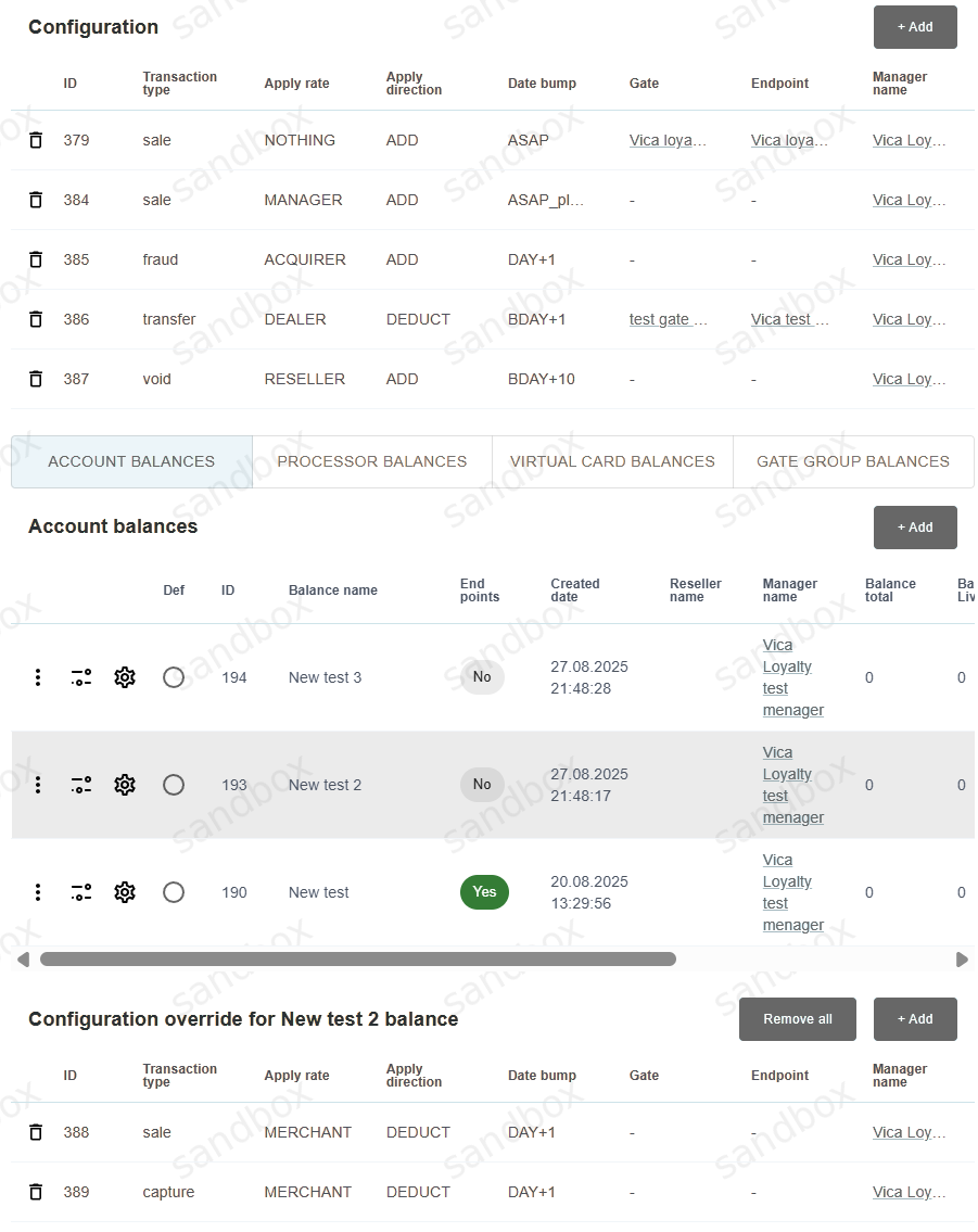 First balance is funded by sale transactions and defunded by payout transactions and is set up for USD currency, also Merchant rates applied for sale transactions. Second balance has override for sale transactions which will deduct balance with amount calculated from manager rate plan.