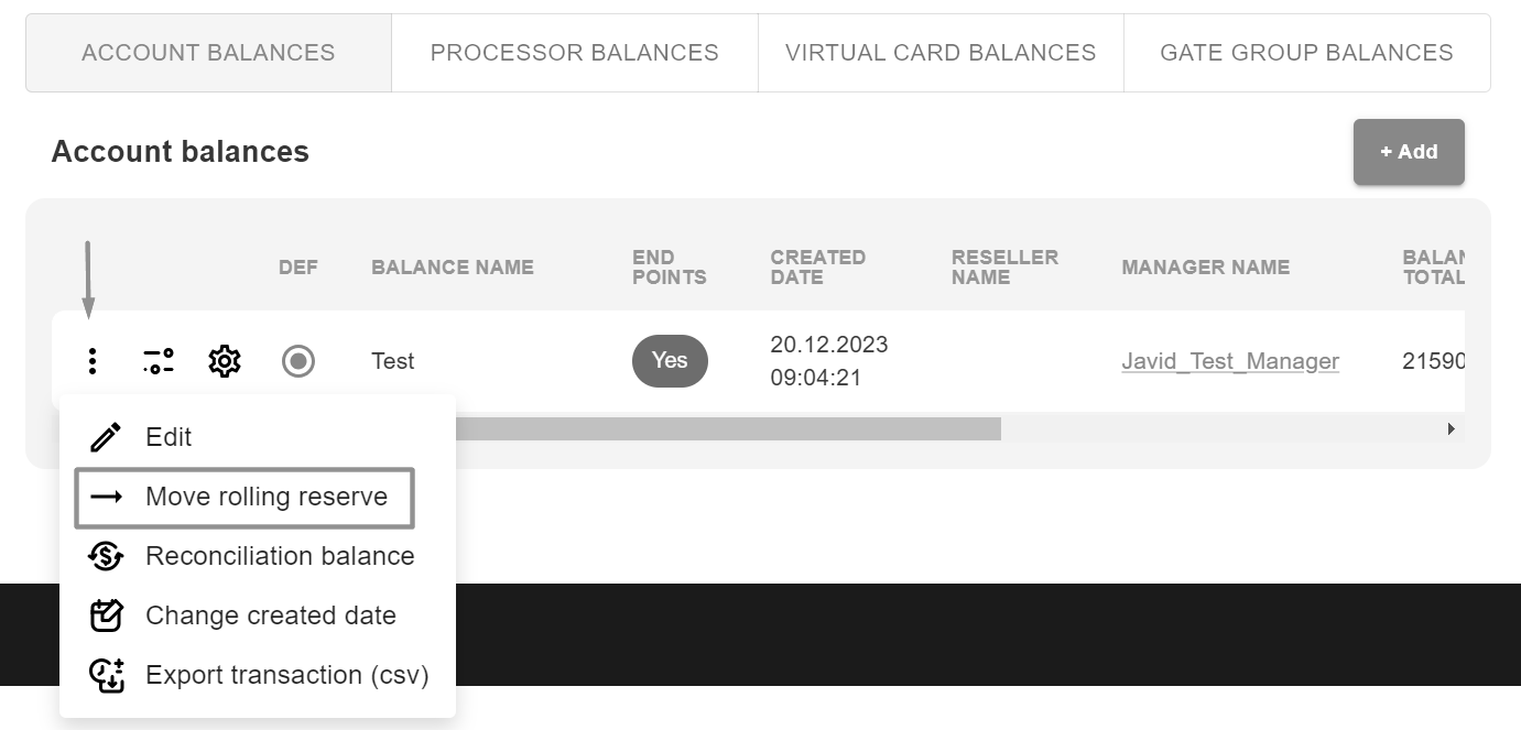 Move Rolling Reserve allows to manually transfer the Rolling Reserve to the active balance, before the release date of the holding. To move Rolling Reserve press 3 dots near balance then Move Rolling Reserve button: