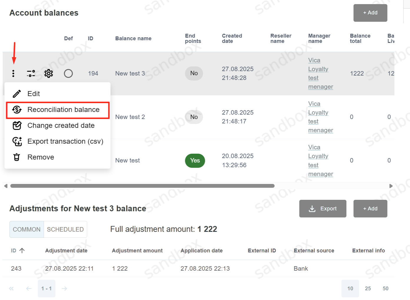 To reconcile balance press 3 dots near balance then Reconciliation Balance button and after Reconcile button:
