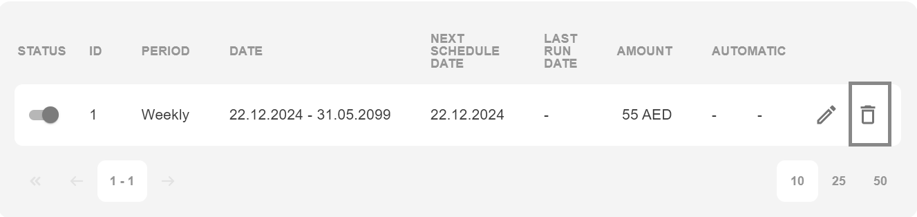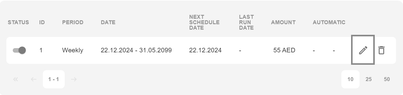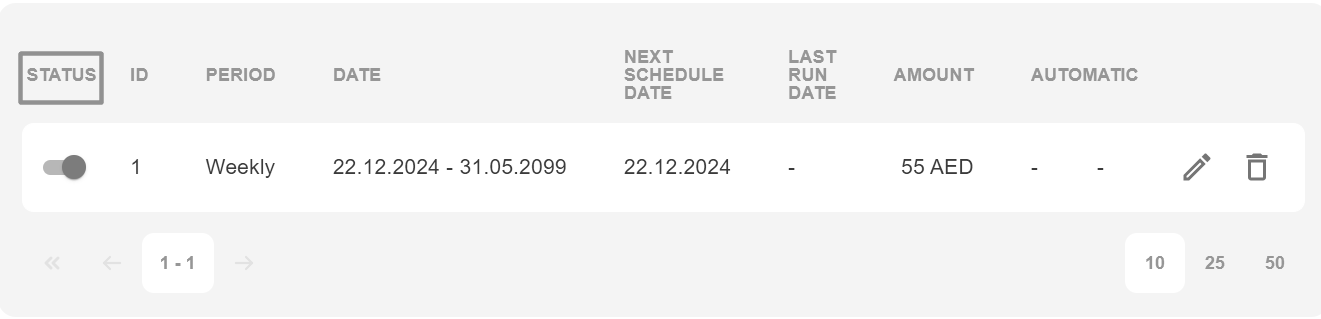 This functionality helps to configure a monthly/weekly fee, which can be set up on the appointed dates every month/week. Scheduled for balance adjustments can be made via Add+ button :