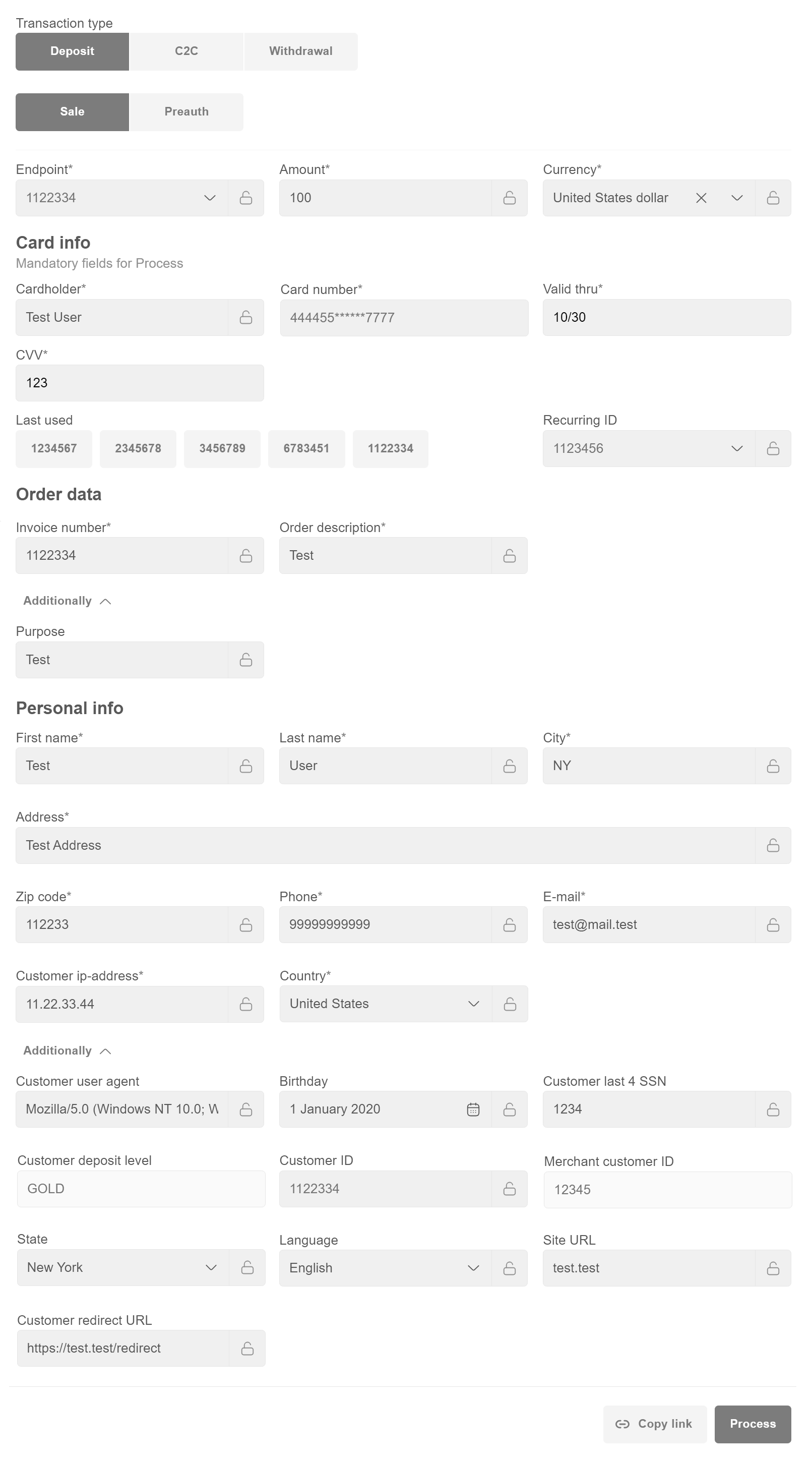The Merchant fills the cardholder data or use recurring IDs for both sender and receiver of funds directly on VT and initiates transfer processing with “Process” button. In this case the transaction must be processed through the non3D channel, which is not common for C2C transfers.